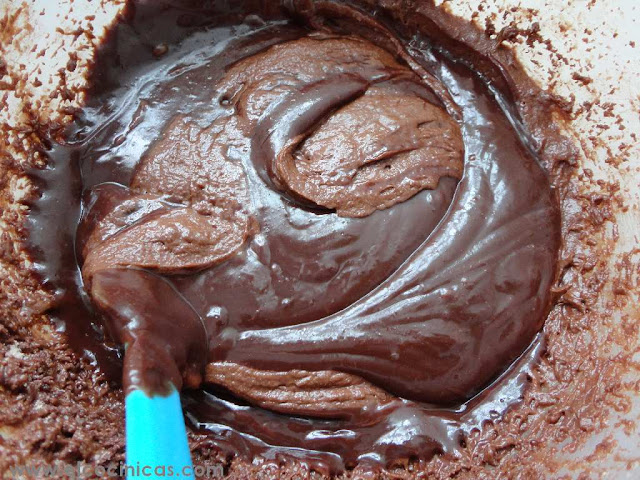 Vertemos la crema de chocolate sobre la preparación anterior e integramos y mezclamos bien con una espátula, por ejemplo:
